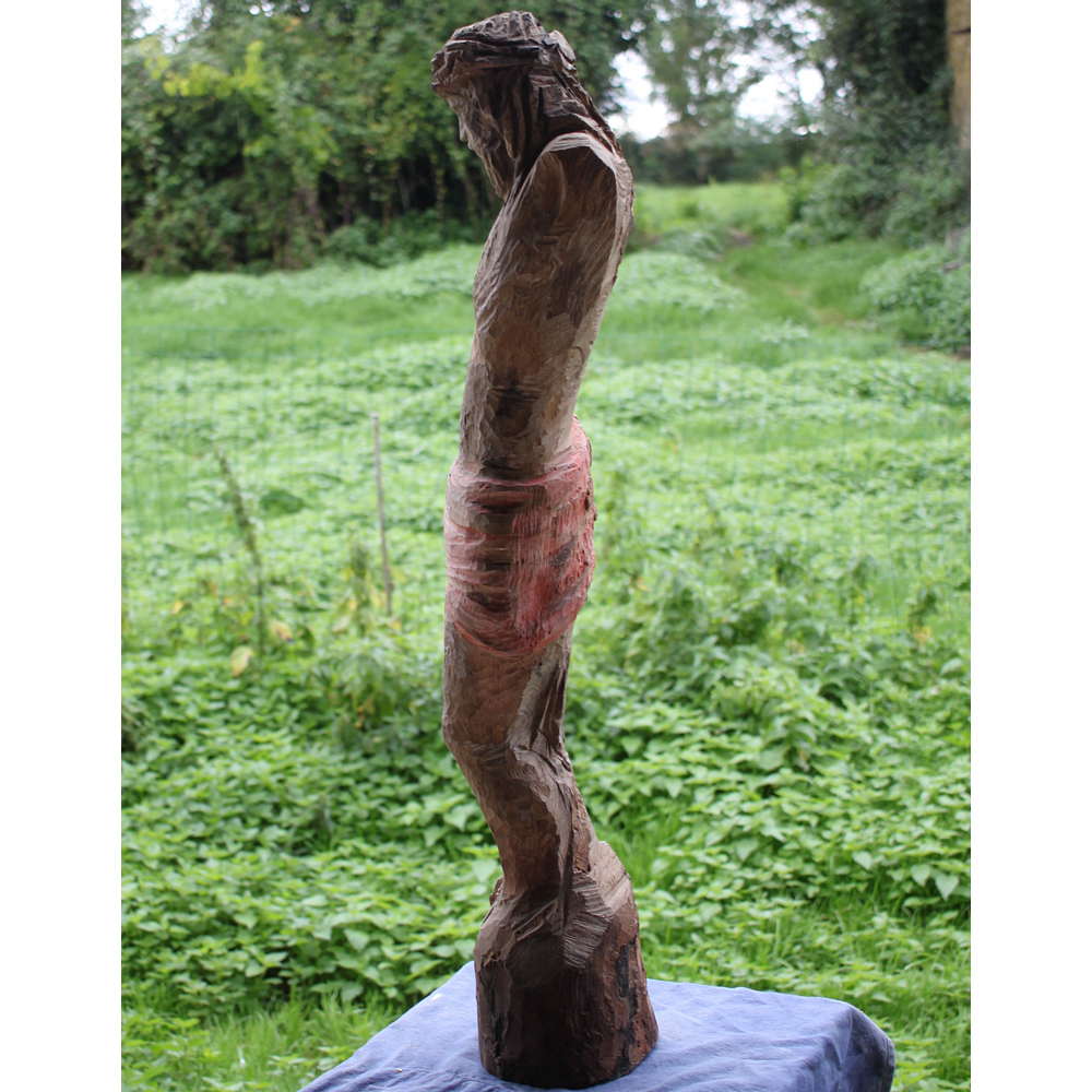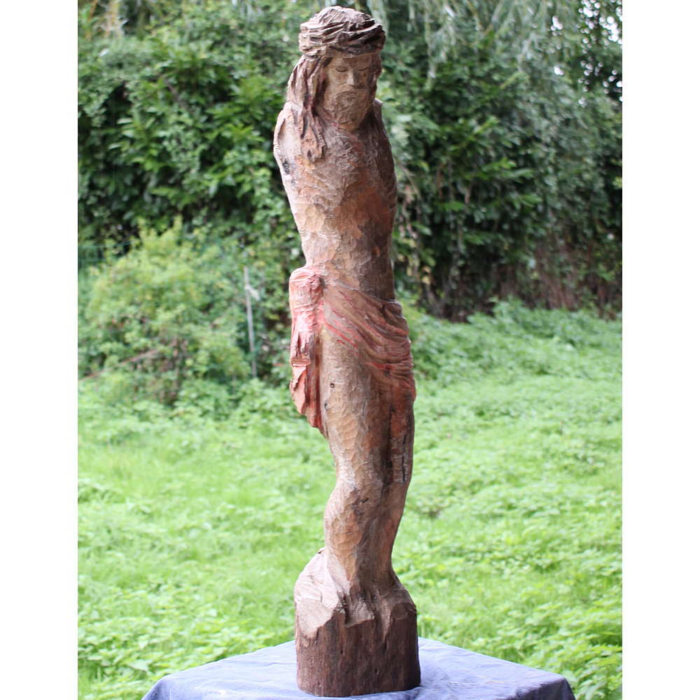 Découvrez cette sculpture unique d’un Christ debout, réalisée à la main dans du bois de chêne massif. Haut de 89 cm, le Christ est représenté dans une posture évoquant la croix, sans les bras, avec un style mêlant authenticité et expression spirituelle.