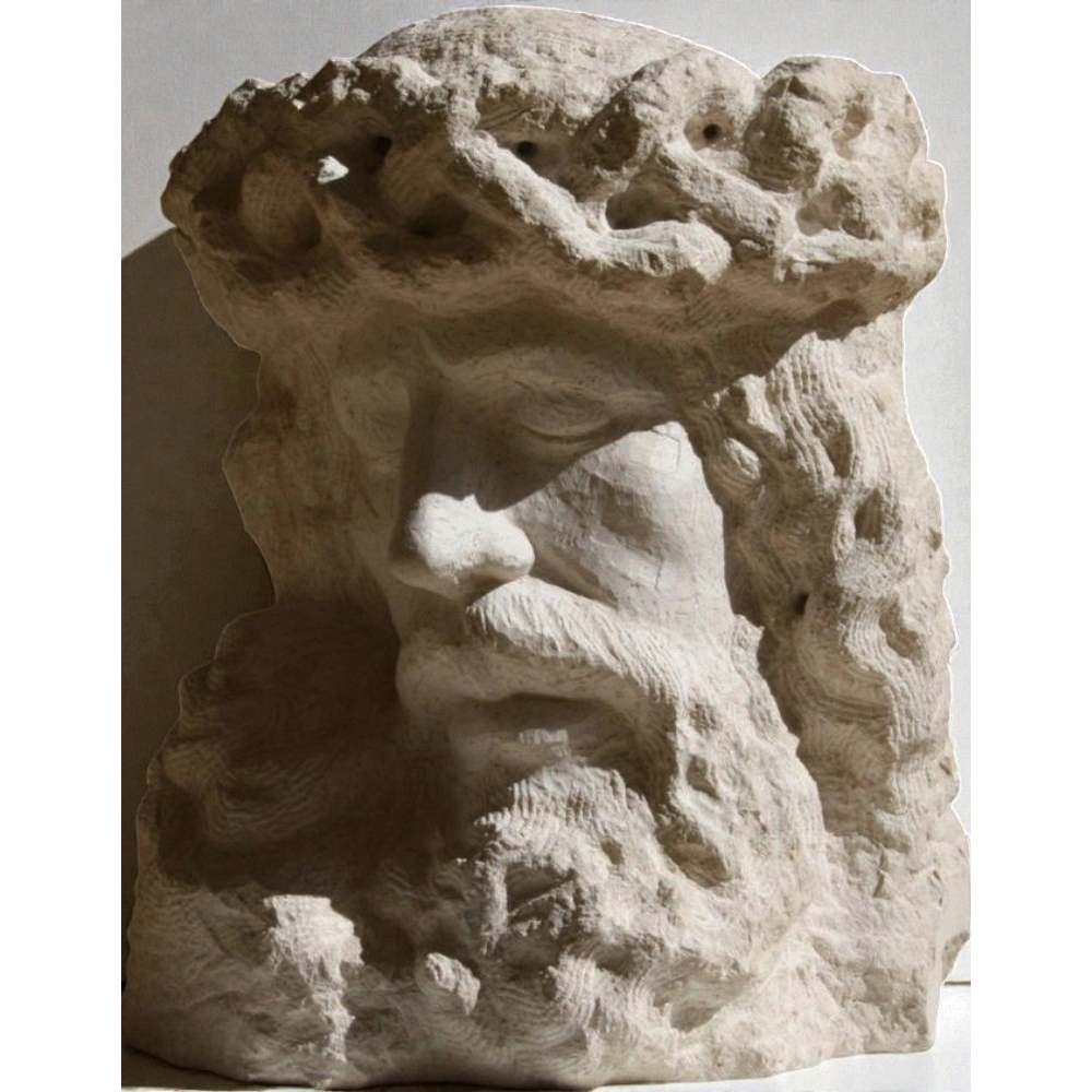 En l’année 2012, je me procurais un bloc de pierre “de Bourgogne” fin et dense, et je réalisais cette tête de Christ en pierre avec des effets de matière les meilleurs.