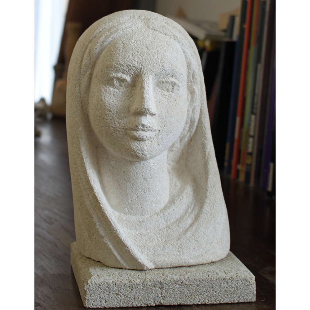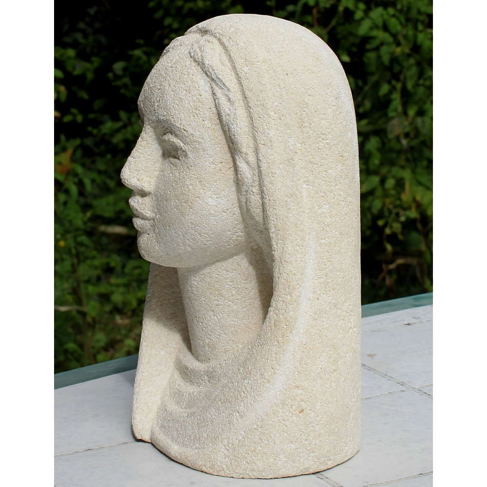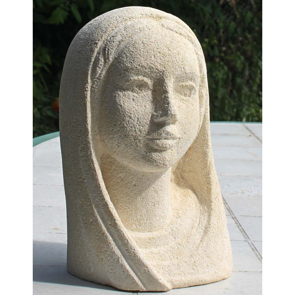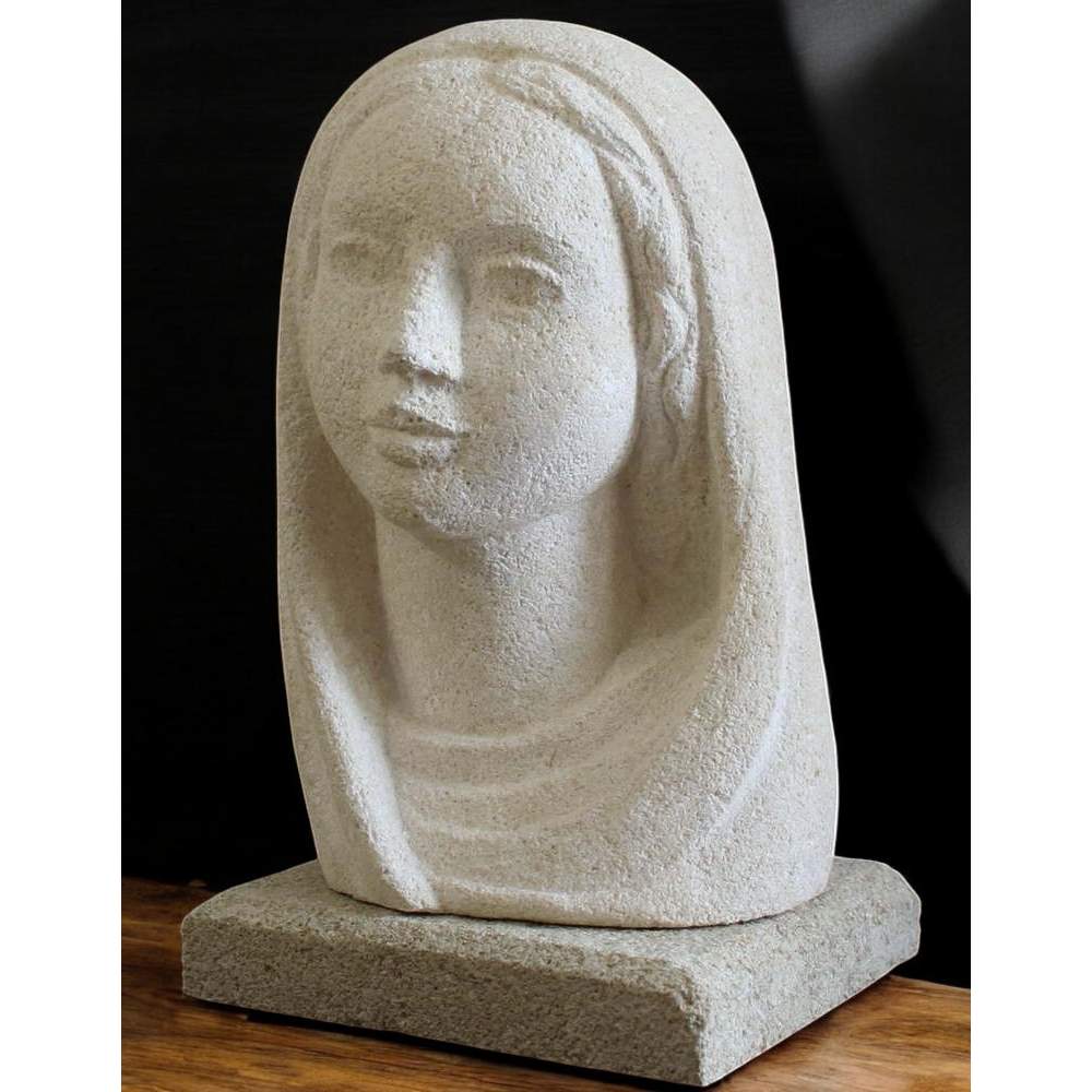 Découvrez la tête de la Vierge- Marie en pierre authentique sculptée à la main.